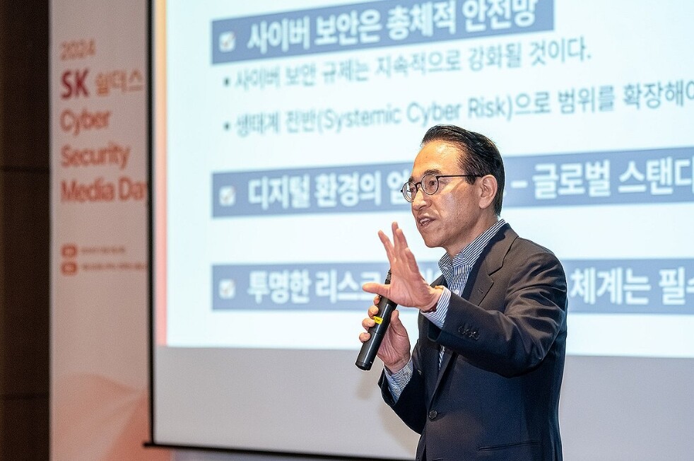 | 3일 서울 강남구 코엑스에서 열린 '2024 사이버 시큐리티 미디어데이'에서 홍원표 SK쉴더스 대표가 발표하고 있다. (사진=SK쉴더스) |