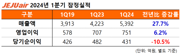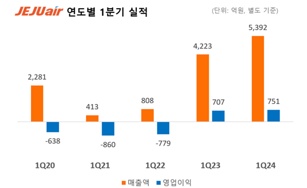 [알파경제=차혜영 기자] 제주항공이 올해 1분기 별도 기준으로 매출 5392억원과 영업이익 751억원을 기록하며 6분기 연속 흑자를 달성했다고 7일 밝혔다.