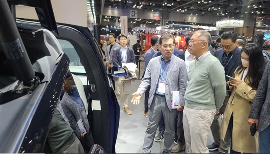 정 회장은 이날 오전 9시 30분쯤 서울모빌리티쇼 전시장에 도착해 경쟁사 부스를 둘러봤다. 정 회장이 모빌리티쇼를 방문한 것은 2019년 이후 4년 만이다.