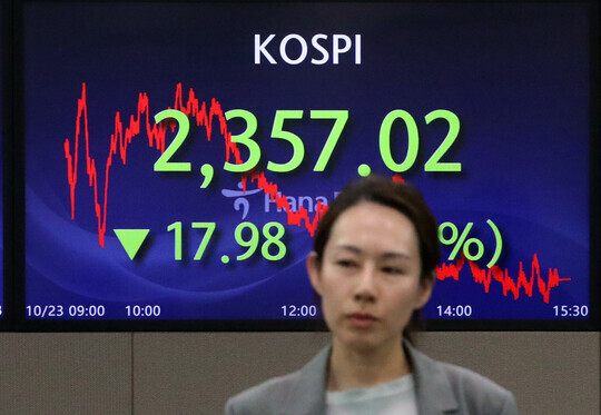 코스피가 전장보다 17.98포인트(0.76%) 내린 2357.02로 마감하며 지난 19일부터 이날까지 3거래일 연속 하락했다. 지수는 전장보다 0.21% 내린 2370.07에 개장한 뒤 오후 들어 낙폭을 확대했다.