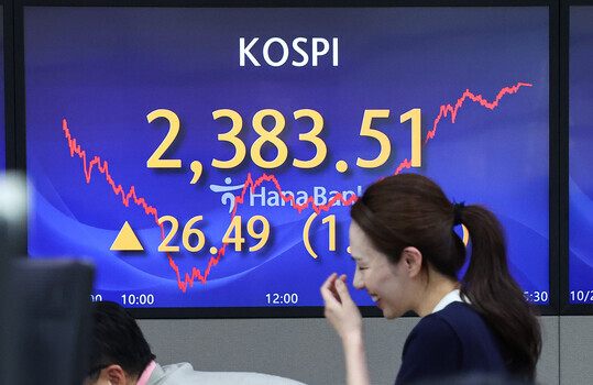 | 24일 오후 서울 중구 하나은행 본점 딜링룸 현황판에 코스피가 표시돼 있다. 이날 코스피는 전 거래일보다 26.49p(1.12%) 오른 2,383.51로 마감했다. (사진=연합뉴스) |