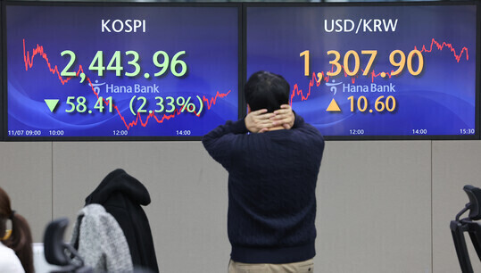 | 공매도 전면 금지 이틀째인 7일 오후 서울 중구 하나은행 본점 딜링룸에서 직원들이 업무를 보고 있다. 이날 코스피가 전장보다 2% 넘게 하락해 2,440대로 내려섰다. (사진=연합뉴스) |