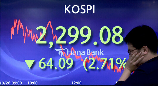코스피가 외국인 매도세에 전 거래일 대비 64.09포인트(2.71%) 내린 2299.08로 마감하면서 2300선 밑으로 떨어졌다. 코스피 지수가 장중 2300선을 밑돈 것은 올해 1월 6일 이후 약 10개월 만이다.