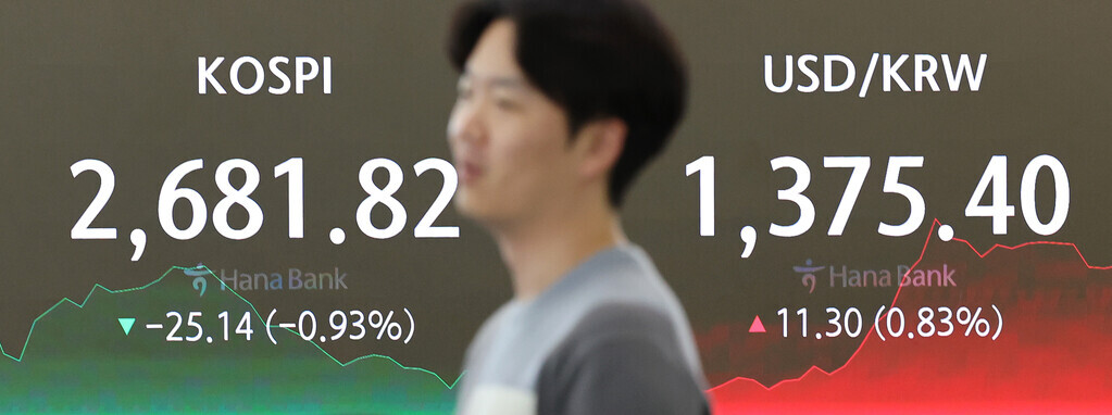 | 12일 오후 서울 중구 하나은행 본점 딜링룸 현황판에 코스피, 원달러 환율이 표시돼 있다. 이날 코스피 종가는 전장보다 25.14포인트(0.93%) 내린 2,681.82로 집계됐다. (사진=연합뉴스) |