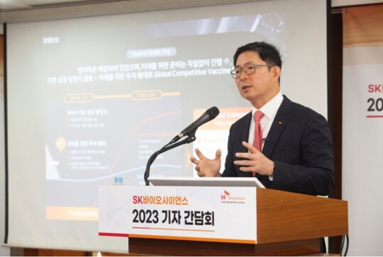 | 안재용 SK바이오사이언스 사장이 28일 서울 중구 프레스센터에서 열린 기자간담회에서 발표하고 있다. (사진=SK바이오사이언스) |