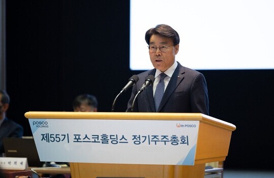 | 최정우 포스코그룹 회장이 17일 서울 대치동 포스코센터에서 제55기 정기주주총회에서 의안에 대해 설명하고 있다. (사진=포스코그룹) |