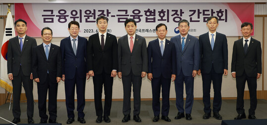 | 김주현 금융위원장이 22일 서울 중구 프레스센터에서 열린 금융위원장-금융협회장 간담회에서 참석자들과 기념 촬영하고 있다. (사진=연합뉴스) |