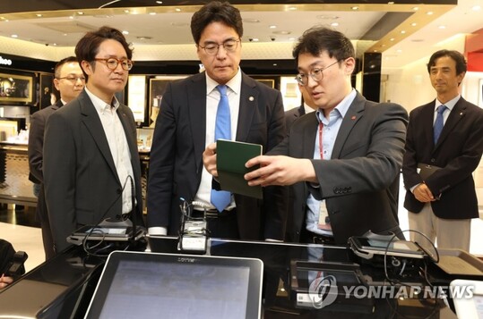 | 윤태식(가운데) 관세청장이 코리아 듀티프리 페스타 현장점검을 나선 4일 오후 서울 중구 롯데면세점 명동본점에서 스마트 신원 인증 시연을 보고 있다. (사진=연합뉴스) |