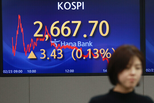 코스피 지수는 전 거래일 대비 3.43포인트(0.13%) 오른 2667.70으로 장을 마감했다. 지수는 이날 상승세로 출발했다가 오후에 기관 투자가들이 순매도로 전환하며 상승분을 대부분 반납했습니다.