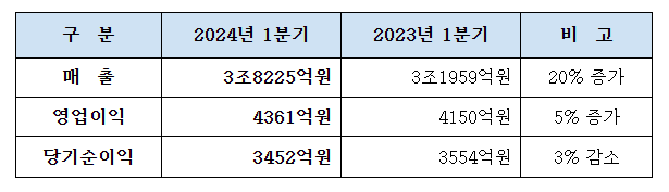 영업이익은 4361억원으로 5% 늘었고, 당기순이익은 3452억원으로 3% 감소했다.