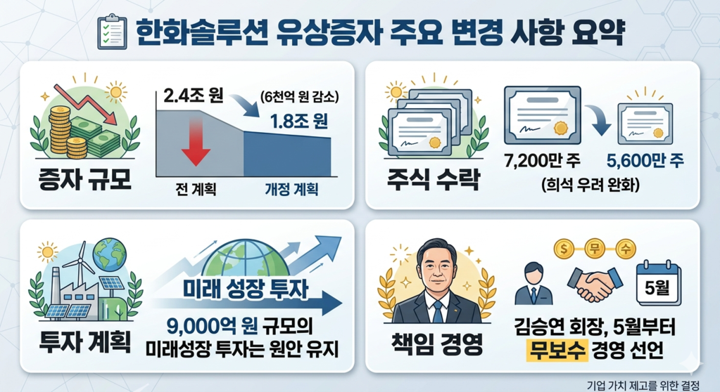 [알파경제=김영택 기자] 한화솔루션이 주주들의 의견을 수렴해 유상증자 규모를 기존 2조 4000억원에서 1조 8000억원으로 6000억원 축소한다고 17일 밝혔다. 이번 결정은 주주가치 보호와 자금 부담 완화를 동시에 달성하기 위한 조치로, 미래 성장 기술 투자와 재무구조 개선이라는 핵심 목표는 유지된다.