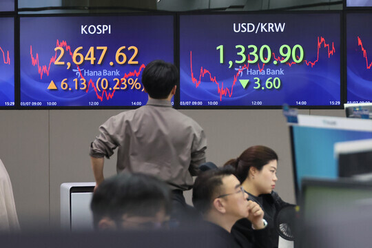| 7일 오후 서울 중구 하나은행 딜링룸 현황판에 코스피와 원달러 환율이 표시돼 있다. (사진=연합뉴스) |