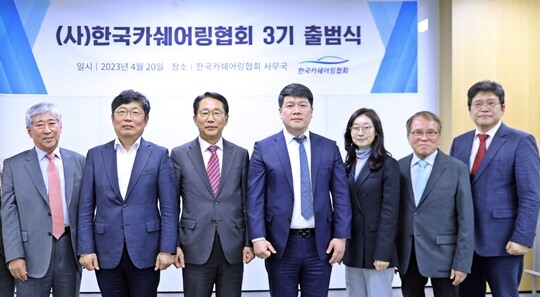 | (사)한국카쉐어링협회가 이창운 회장(사진 좌측 세 번째)을 중심으로 한 3기 출범식을 개최 후 주요 임원·자문단과 함께 기념 촬영을 하고 있다. (사진 좌측 두 번째 김재문 부회장, 우측 네 번째 김종열 부회장 우측 첫 번째 강휘진 감사) (사진=한국카쉐어링협회) |