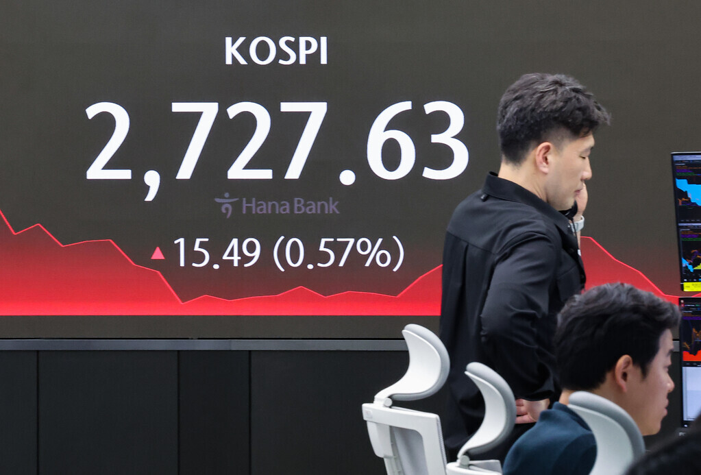 외인과 기관의 쌍끌이 매수에 코스피 지수가 전 거래일 대비 15.49포인트(0.57%) 오른 2727.63에 장을 마쳤다. 개인이 홀로 4869억원을 팔았고 외국인과 기관은 각각 1475억원, 3554억원을 사들였다.