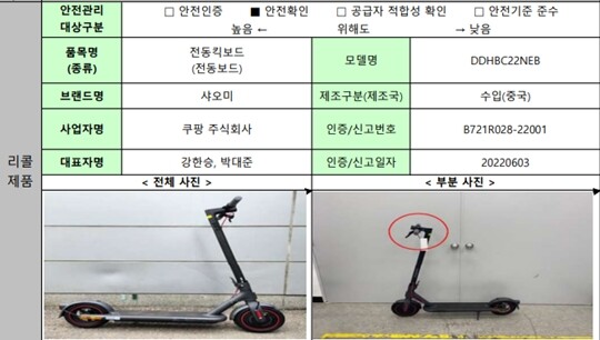 특히 전동 킥보드 품목에서는 쿠팡이 수입해 판해만 샤오미 제품(DDHBC22NEB)을 포함해 5개사의 수입 제품에서 절연저항 부적합, 미신고 배터리 장착 등 안전기준 부적합이 드러났다.