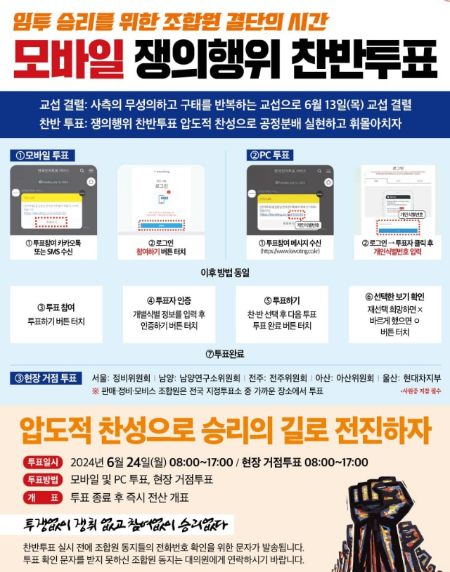 현대차 노조는 24일 오후 6시 전체 조합원(4만3160명)을 대상으로 한 쟁의행위(파업) 찬반투표 결과, 4만1461명(투표율 96.06%)이 투표, 3만8829명(재적 대비 89.97%, 투표자 대비 93.65%)이 찬성했다.