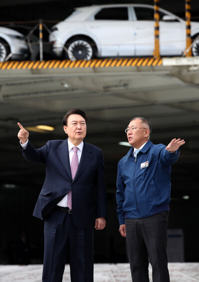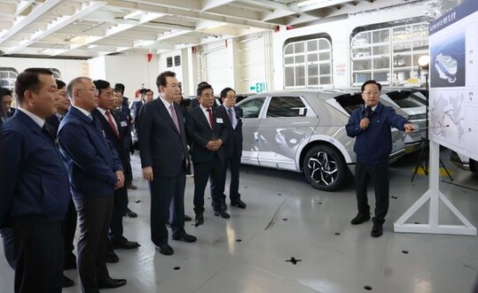 윤 대통령은 현대차그룹의 수출상황을 점검한 뒤 현대차 5공장을 찾아 자동차 산업의 미래 먹거리인 전기차 신공장 건설계획을 들었다.
