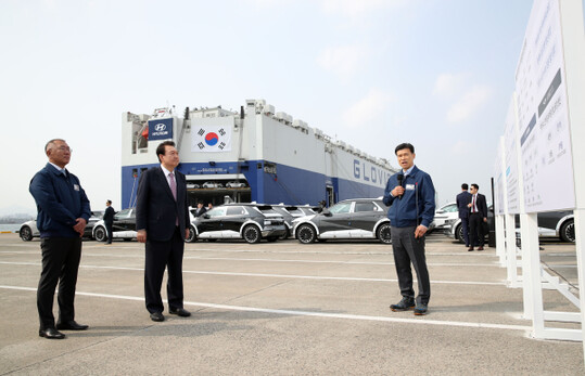 9일 현대차그룹에 따르면 윤 대통령은 이날 울산 석유화학복합시설 기공식과 경제인 간담회에 참석한 후 현대차 울산공장을 찾아 자동차 수출 선적부두와 울산5공장 제네시스 생산 라인 등을 둘러봤다.