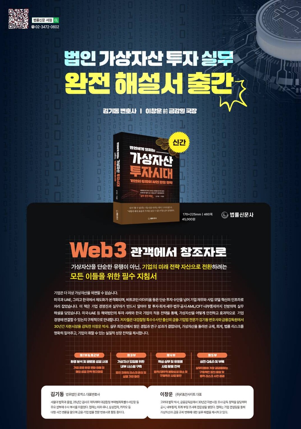 『법인에게 열리는 가상자산 투자시대: 기업의 투자와 사업 활용 전략』(법률신문사 펴냄)은 2025년 2월 금융위원회가 발표한 '법인의 단계적 가상자산시장 참여 허용' 방침 이후, 구체적인 실행 전략과 리스크 관리 방안 마련에 어려움을 겪는 국내 기업들에게 실질적인 해법을 제공한다.