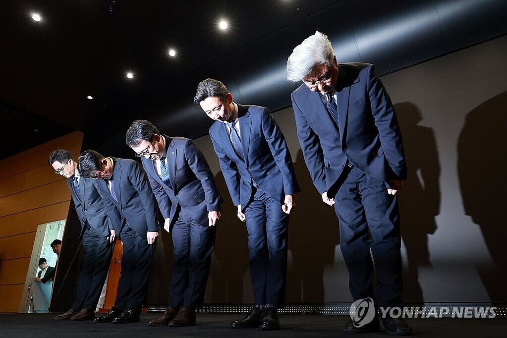 | 유영상 SK텔레콤 대표이사(가운데)가 25일 서울 중구 SKT타워 수펙스홀에서 SK텔레콤 이용자 유심(USIM) 정보가 해커 공격으로 유출된 것과 관련해 고개 숙여 사과하고 있다. (사진=연합뉴스) |