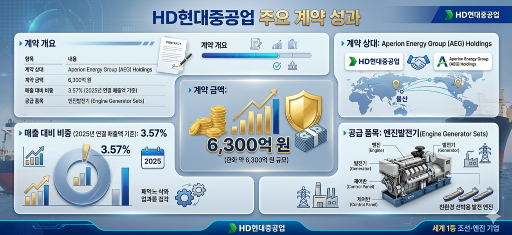 23일 인공지능공시분석 프로그램 타키온월드에 따르면, HD현대중공업은 미국 Aperion Energy Group(AEG) 홀딩스와 총 6300억 원 규모의 엔진발전기 공급 계약을 체결했다고 공시했습니다.