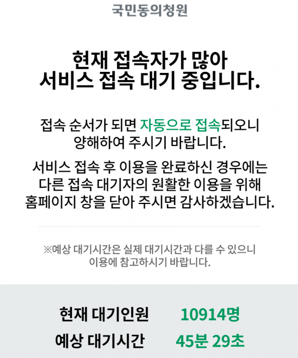 국회 청원 사이트에 접속자가 폭주하면서 예상 대기 시간까지 발생하고 있다.