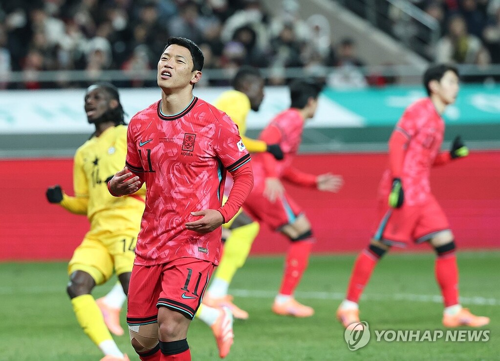 | 18일 서울 마포구 서울월드컵경기장에서 열린 남자축구 국가대표 A매치 평가전 대한민국과 가나의 경기. 한국 황희찬이 페널티킥을 실패한 뒤 아쉬워하고 있다. 사진=연합뉴스 |