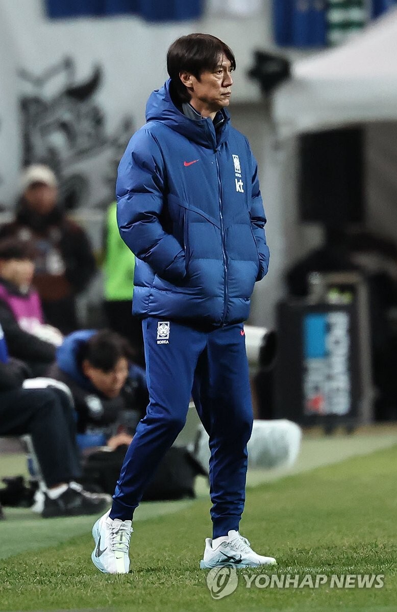 | 18일 서울 마포구 서울월드컵경기장에서 열린 남자축구 국가대표 A매치 평가전 대한민국과 가나의 경기. 홍명보 감독이 경기를 지켜보고 있다. 사진=연합뉴스 |