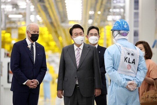 | 윤석열 대통령과 조 바이든 미국 대통령이 지난해 5월 이재용 부회장의 안내를 받으며 경기 평택 삼성전자 반도체 공장을 시찰하고 있다. (사진=연합뉴스) |