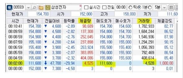 | 누군가 던진 4528주의 물량에 삼성전자의 주가는 순식간에 하한가로 직행했다. (사진=온라인 커뮤니) |