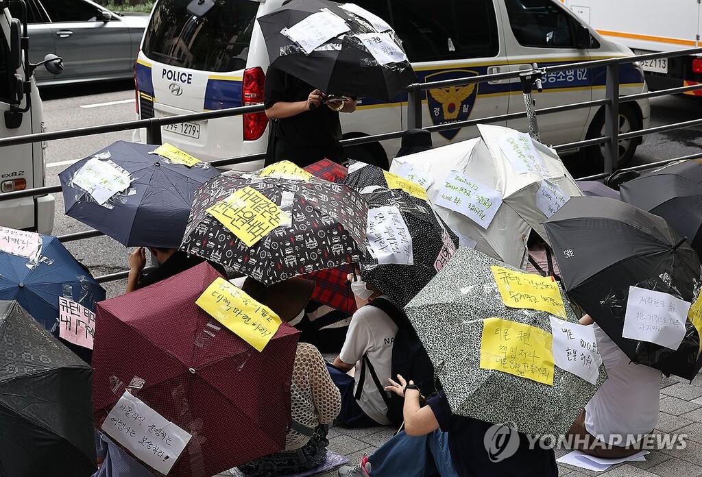 28일 서울 강남구 역삼동 큐텐코리아 본사가 앞에는 티몬·위메프 환불 지연 피해를 입은 소비자들이 모여 우산 집회를 열었다.