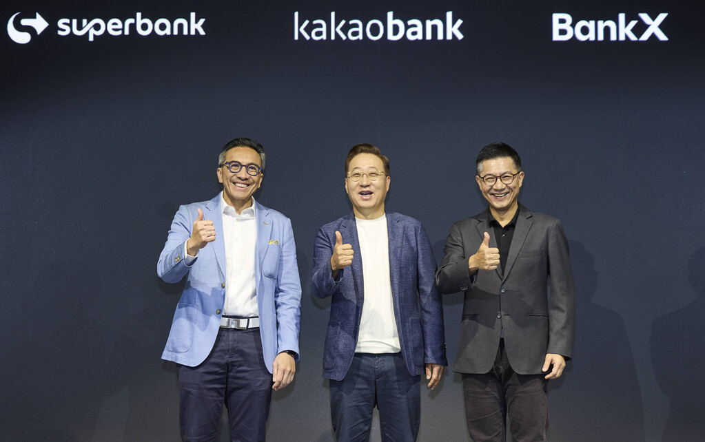 | 윤호영 카카오뱅크 대표이사(가운데)가 8일 서울시 영등포구에서 열린 2026 카카오뱅크 프레스톡에서 슈퍼뱅크 티고르 M. 시아한 대표(Tigor M.Siahaan, 왼쪽), 뱅크X 뿐나맛 위찟끌루왕싸 대표 (Punnamas Vichitkulwongsa, 오른쪽)와 함께 기념 촬영을 하고 있다. (사진=카카오뱅크) |
